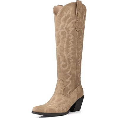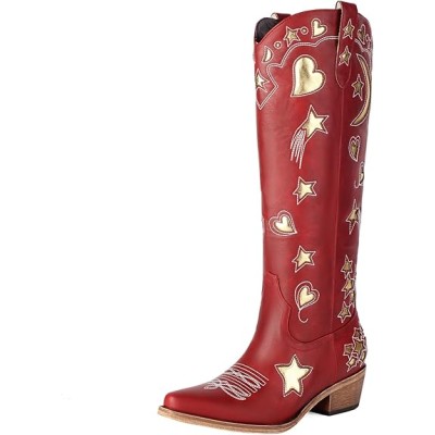 Western Cowboy Boots for Women Knee High, Stars Moon Heart Patterns Low Heel