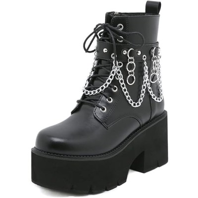 Women's Chain Platform Boots Lace Up & Zipper Chunky Heel Black Combat Ankle Booties Fashion Studded Motorcycle Boots