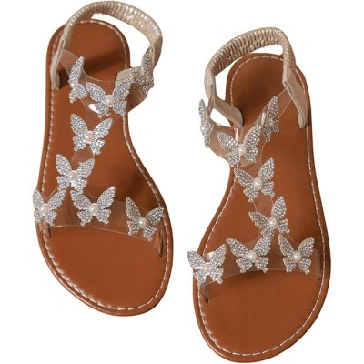 Women's Elegant Rhinestone Butterfly Transparent Elastic Strap Summer Flat Sandals
