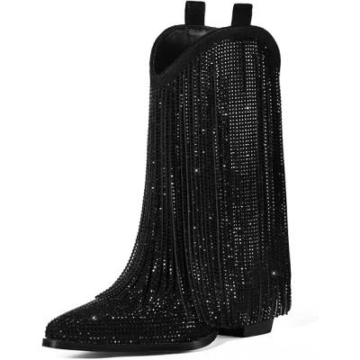Cowboy Boots for Women - Cowgirl Western Rhinestone Sparkly Fringe Chunky Heel Pointed Toe Ankle Boots